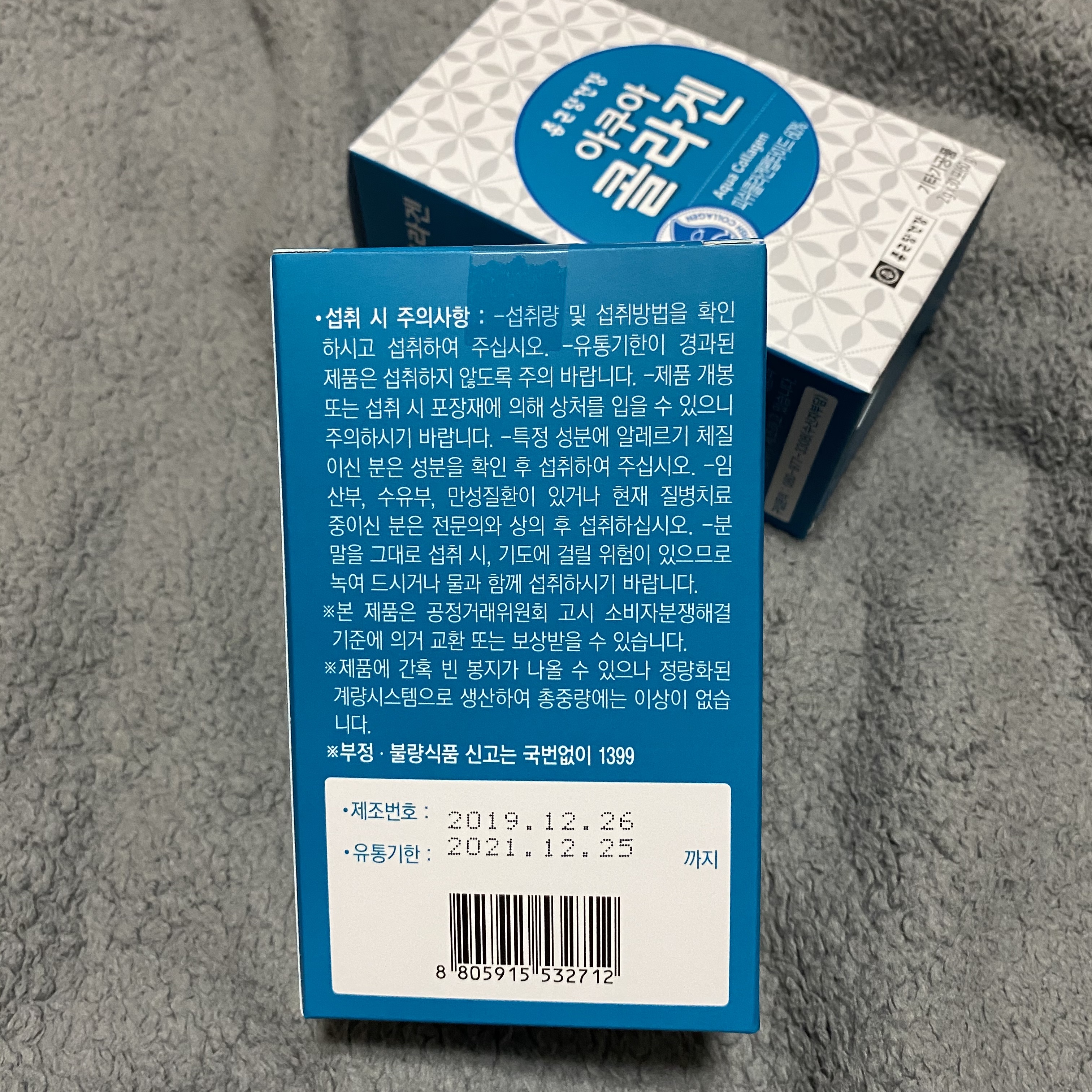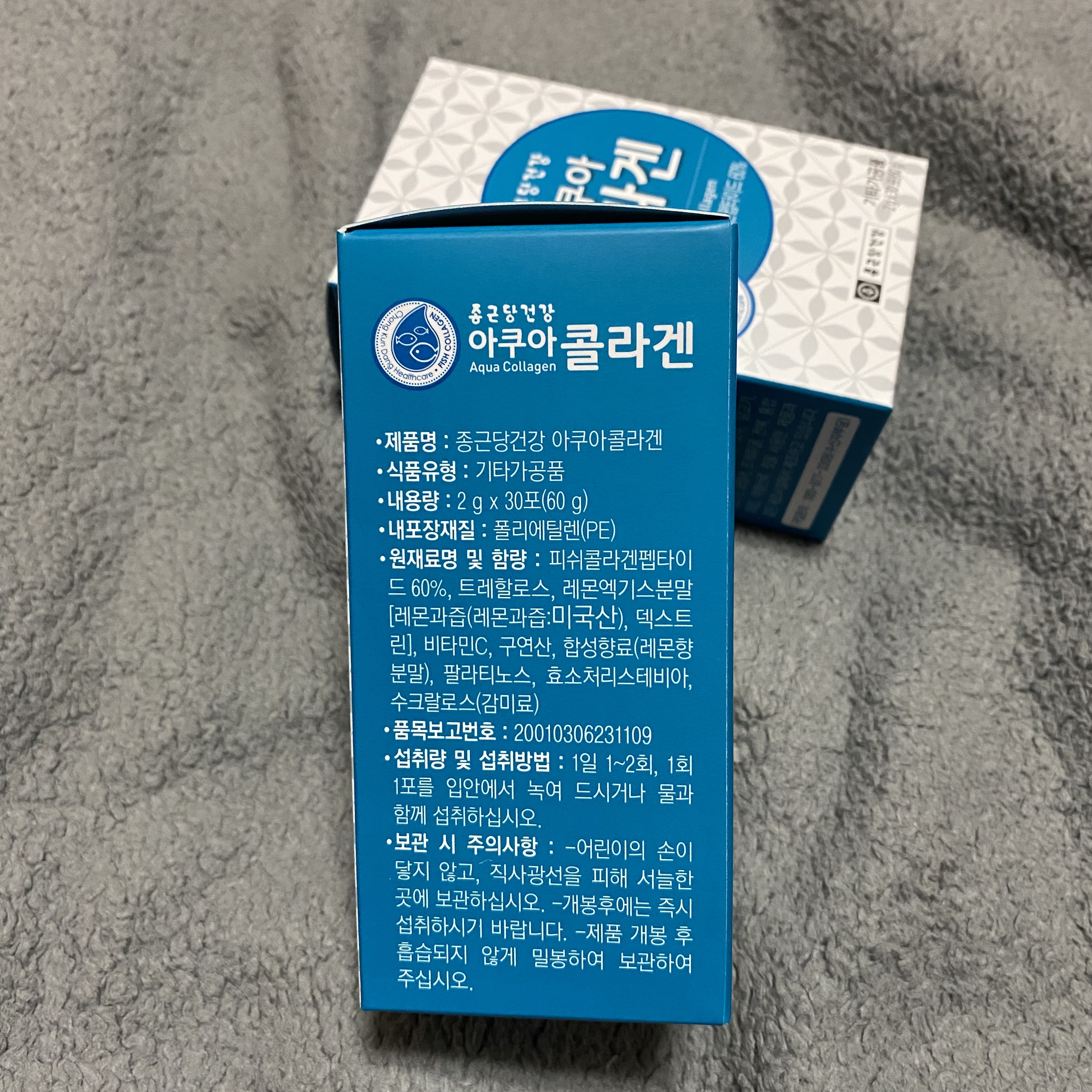 한 박스에 2g짜리 콜라겐이 30포씩, 총 2박스(60포)가 배송되어 왔고요. 섭취량이 1일 1~2회라서 아침과 저녁 1포씩 한 달을 먹을 예정이랍니다.