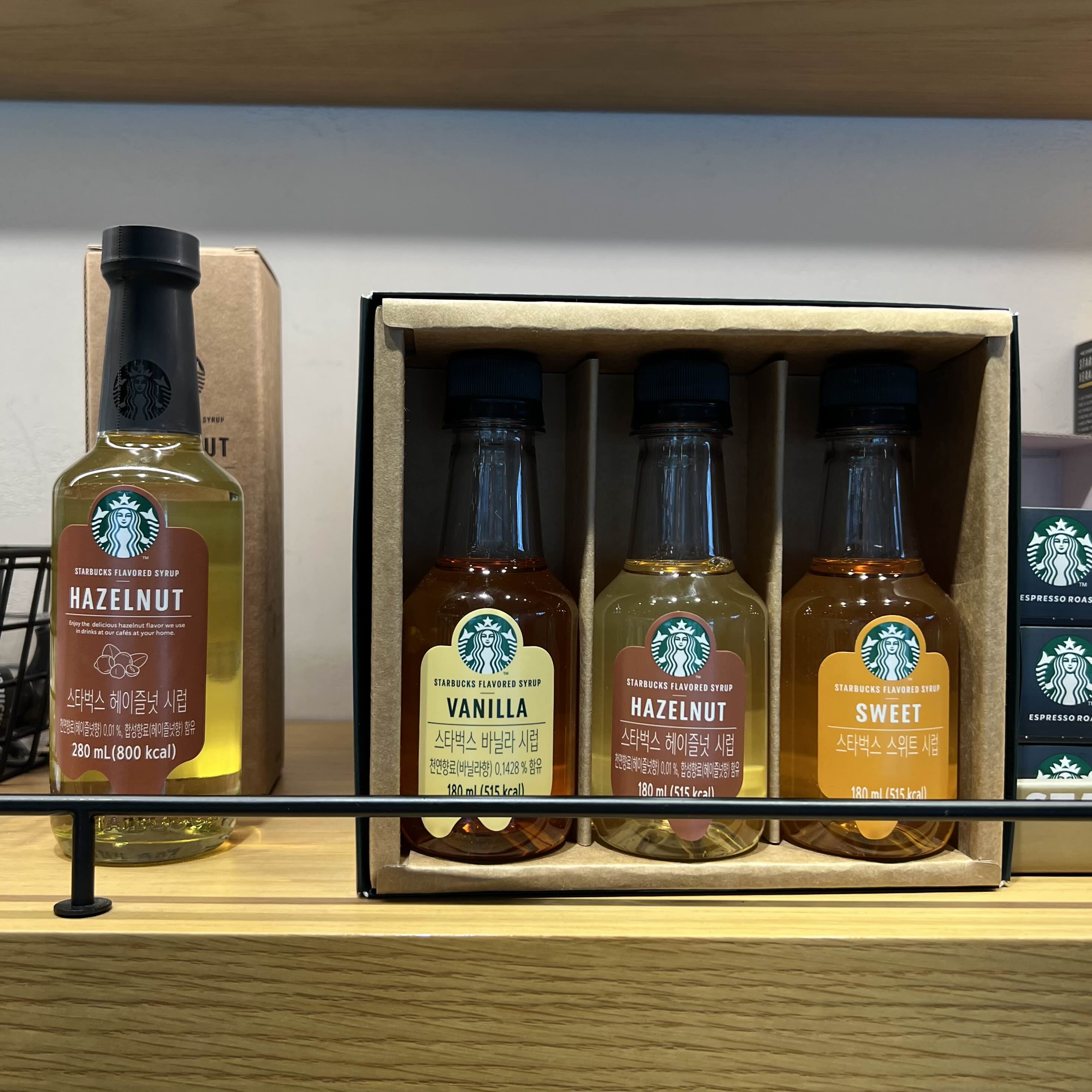한창 스타벅스 드라이브스루만 이용하다가 간만에 들러본 스타벅스 매장. 매장에 방문하면 사지도 않을 스타벅스 텀블러 구경하곤 하는데, 한국에선 판매하지 않는다고 알고 있었던 스타벅스 시럽이 딱 보이더라고요.