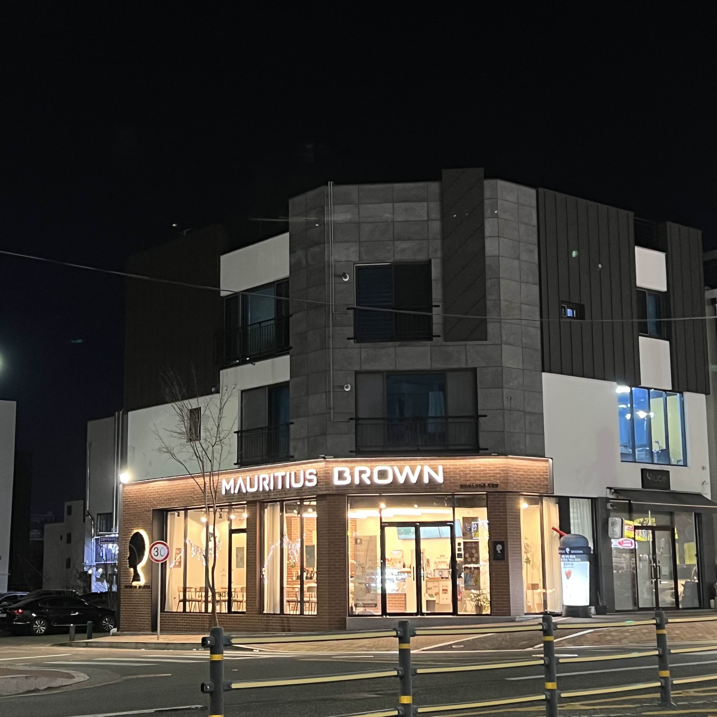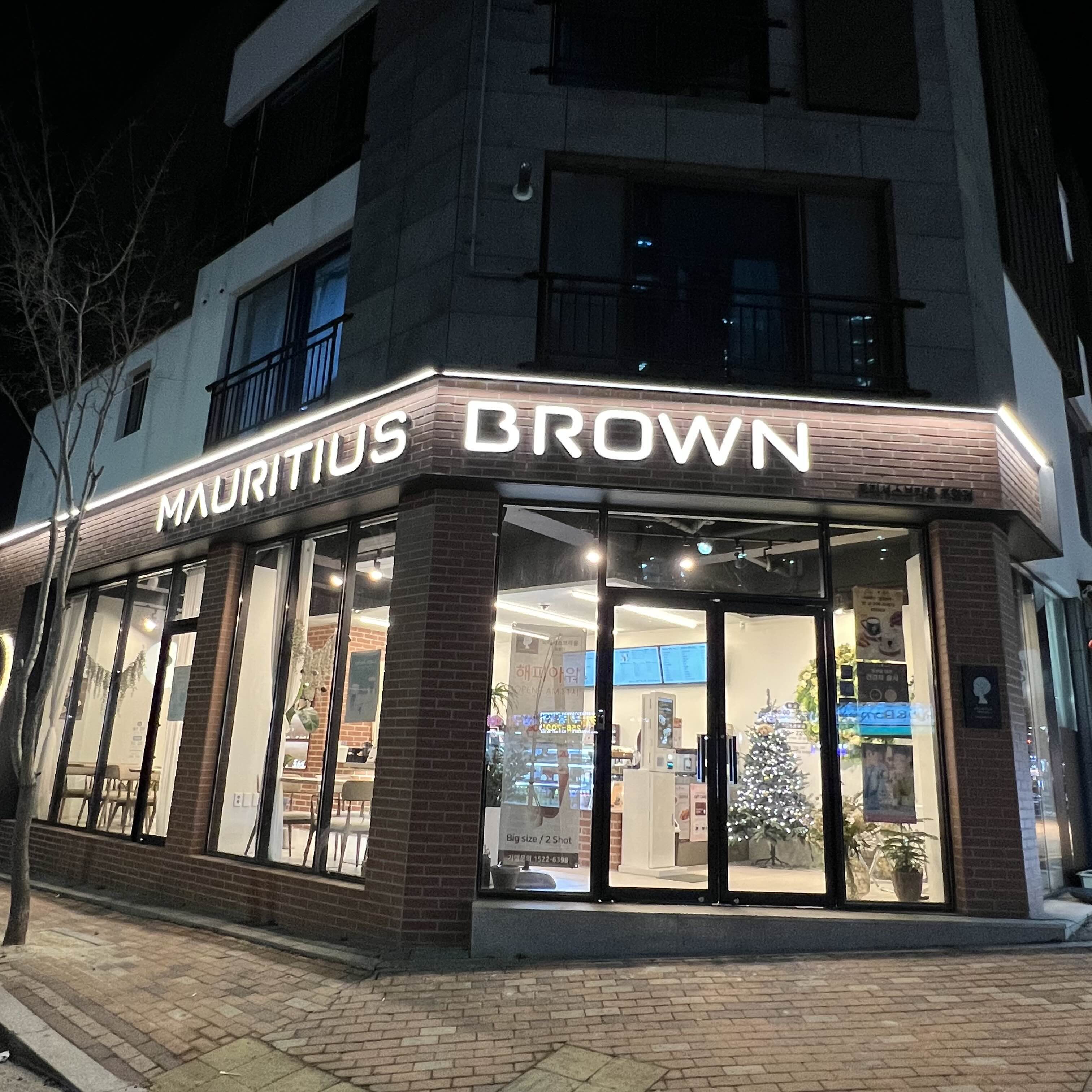 빨간 벽돌에 밝은 조명이 있어 멀리서 봐도 시선을 확 끄는 모리셔스브라운 포항점의 외부모습.
