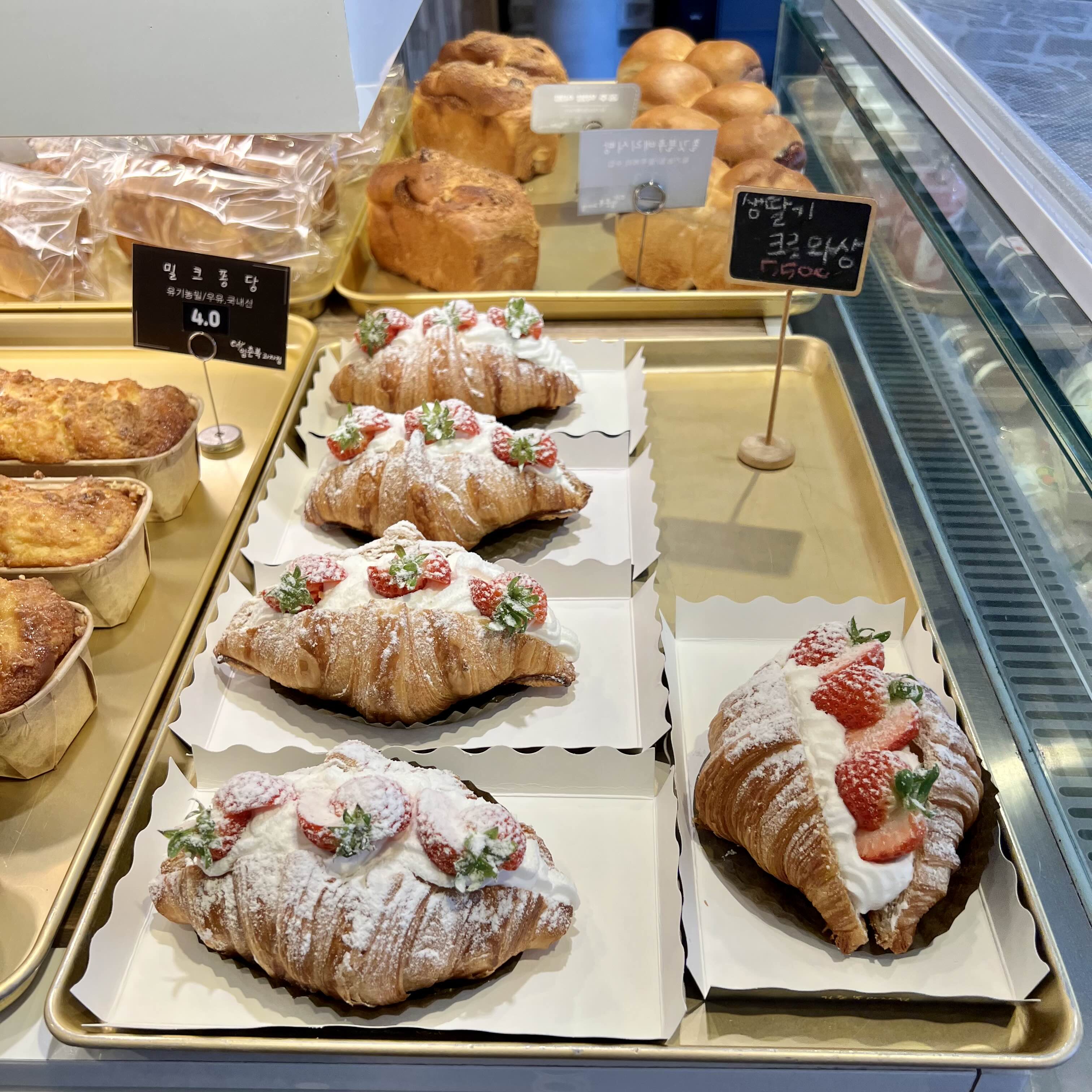 1월부터 5월까지 제철과일인 딸기로 만든 생딸기 크로와상도 있네요. 임춘복과자점은 무방부제, 무보존제, 무첨가물 100% 동물성 우유생크림을 사용한다고 해요.