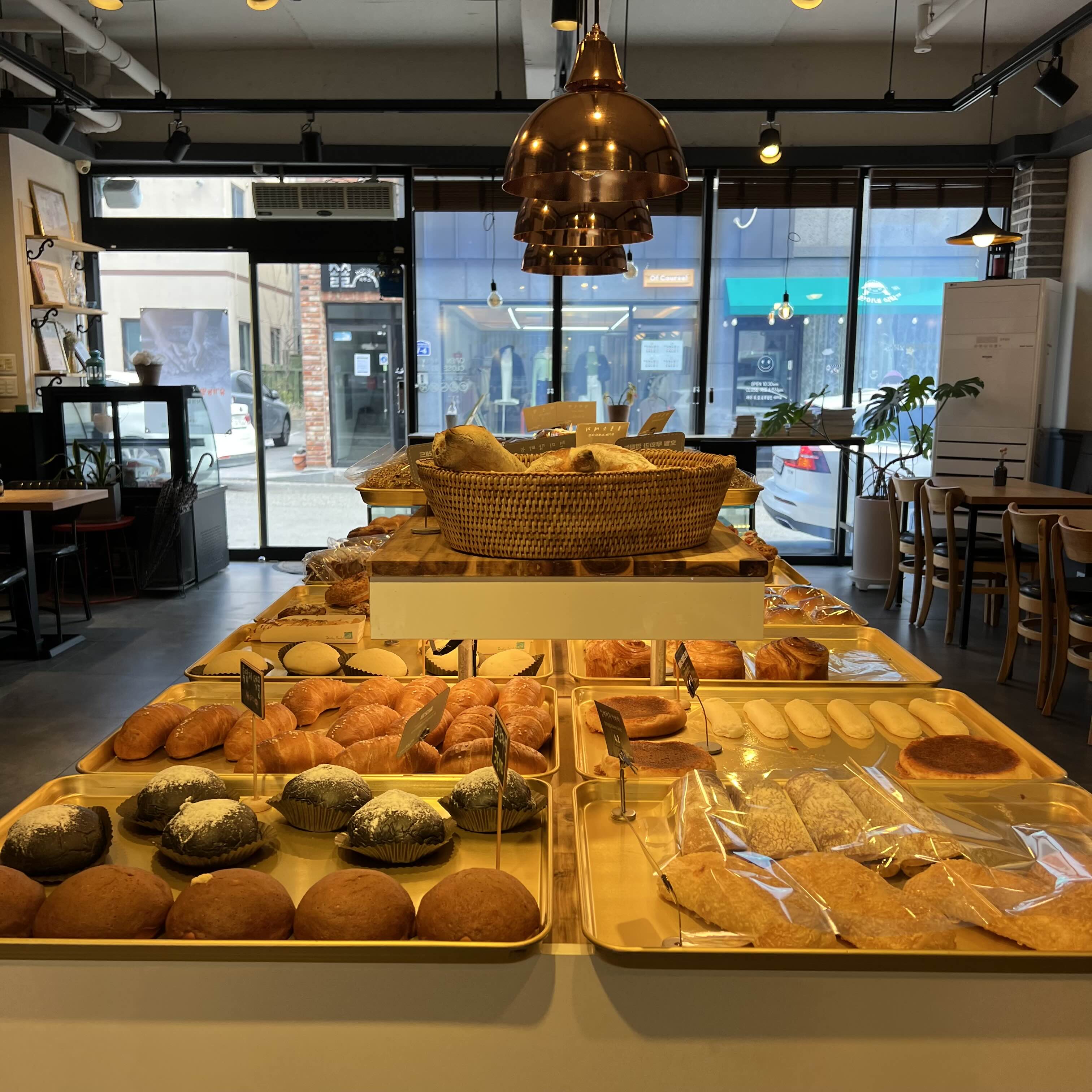 중앙에는 맛있는 빵이 진열되어 있어요.