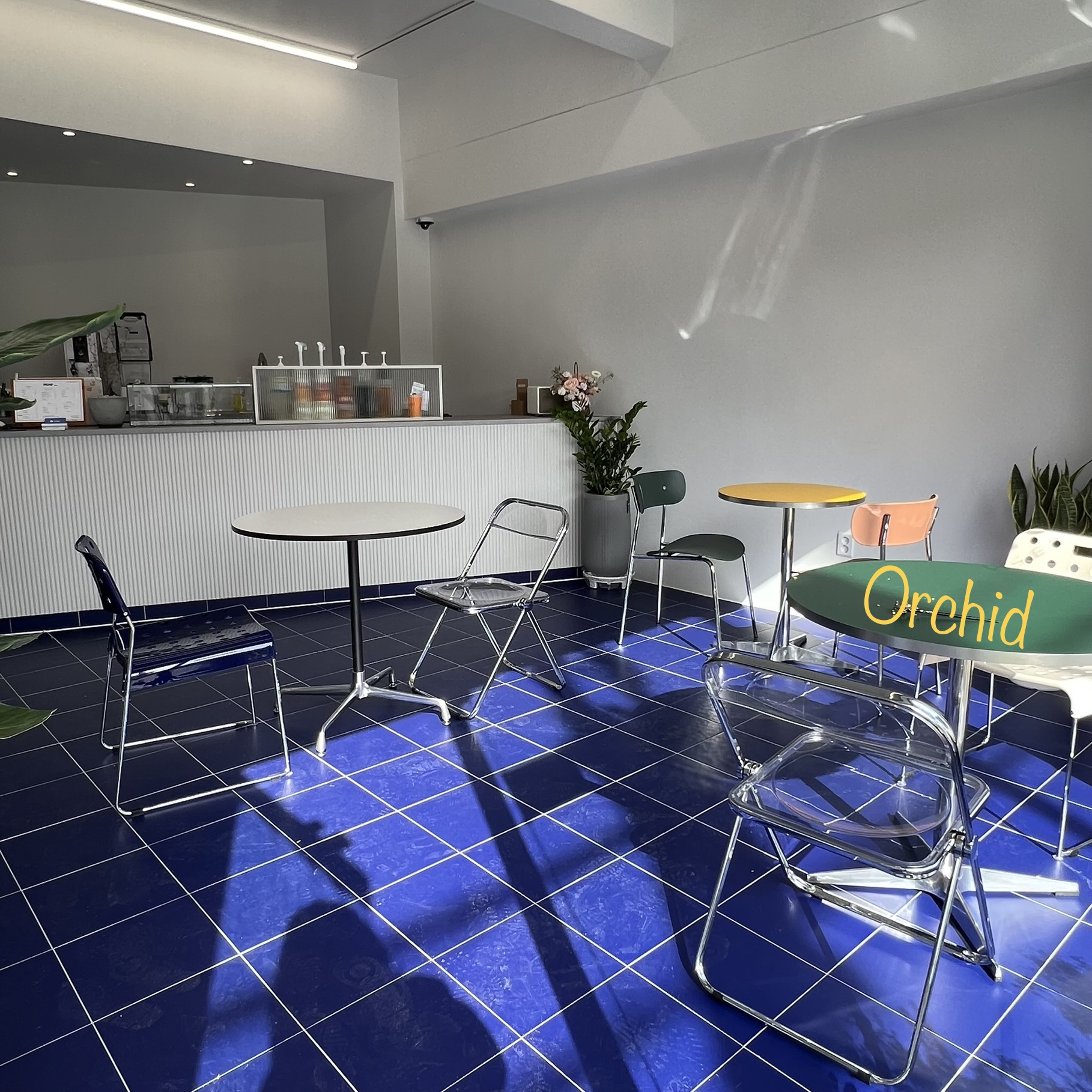 파란 간판에 파란 타일 coffee&dessert cafe 오키드.