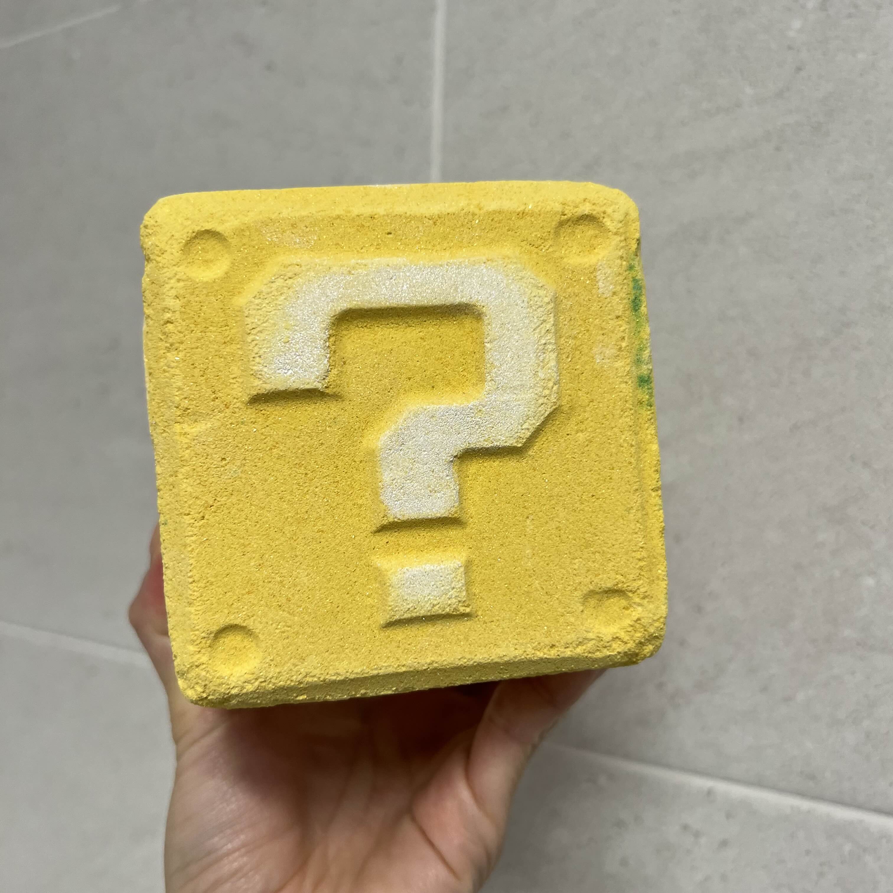 노란 정사각형에 물음표 모양이 있는 슈퍼마리오 물음표 배쓰밤. 슈퍼마리오 게임할 때 나오는 물음표상자 모습과 똑같아서 추억돋더라고요.