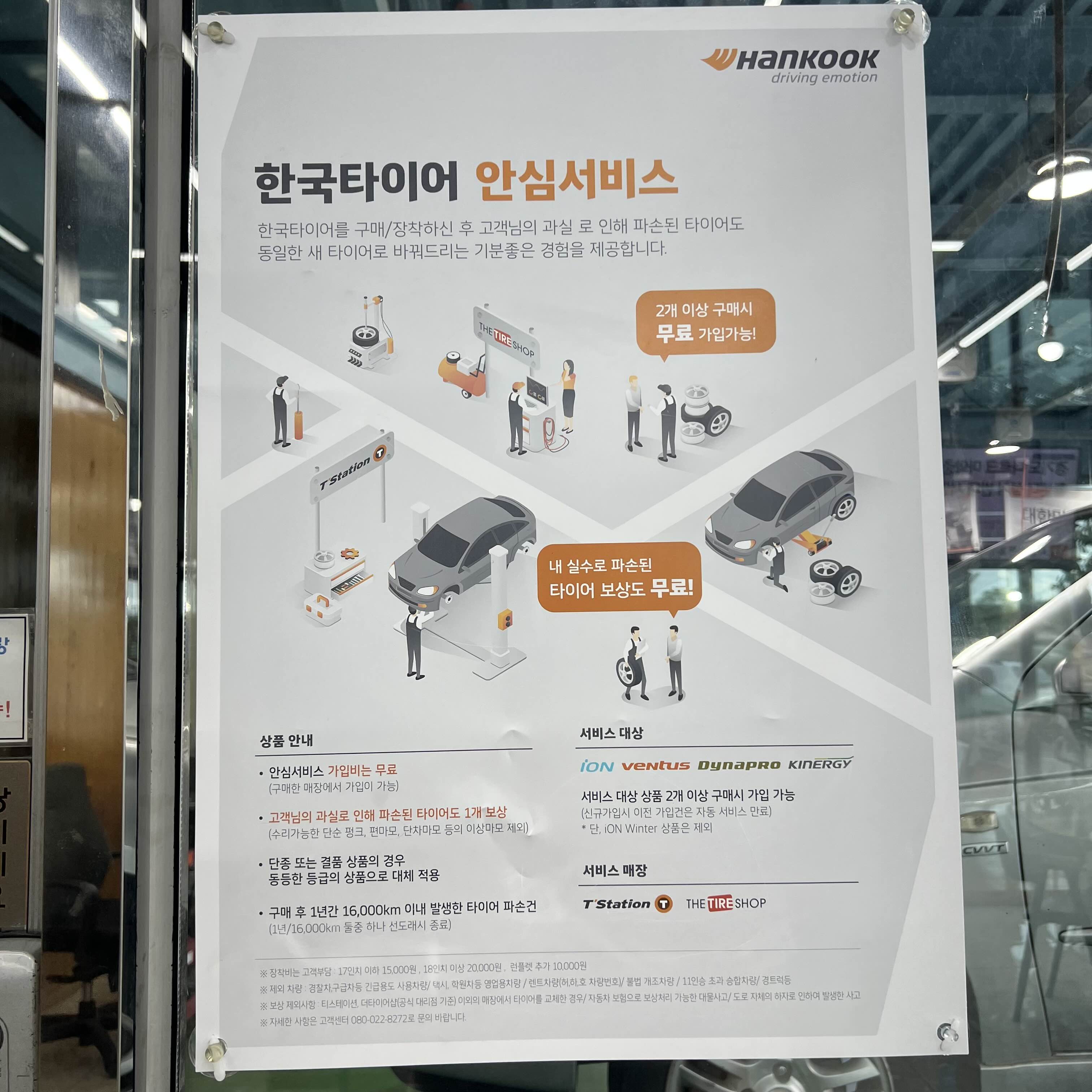 한국타이어 2개이상 구매 시 무료가입가능한 안심서비스 구매 후 1년 또는 16,000km 이내 발생한 타이어의 파손은 고객의 과실파손이더라도 무료 보상하는 서비스예요.