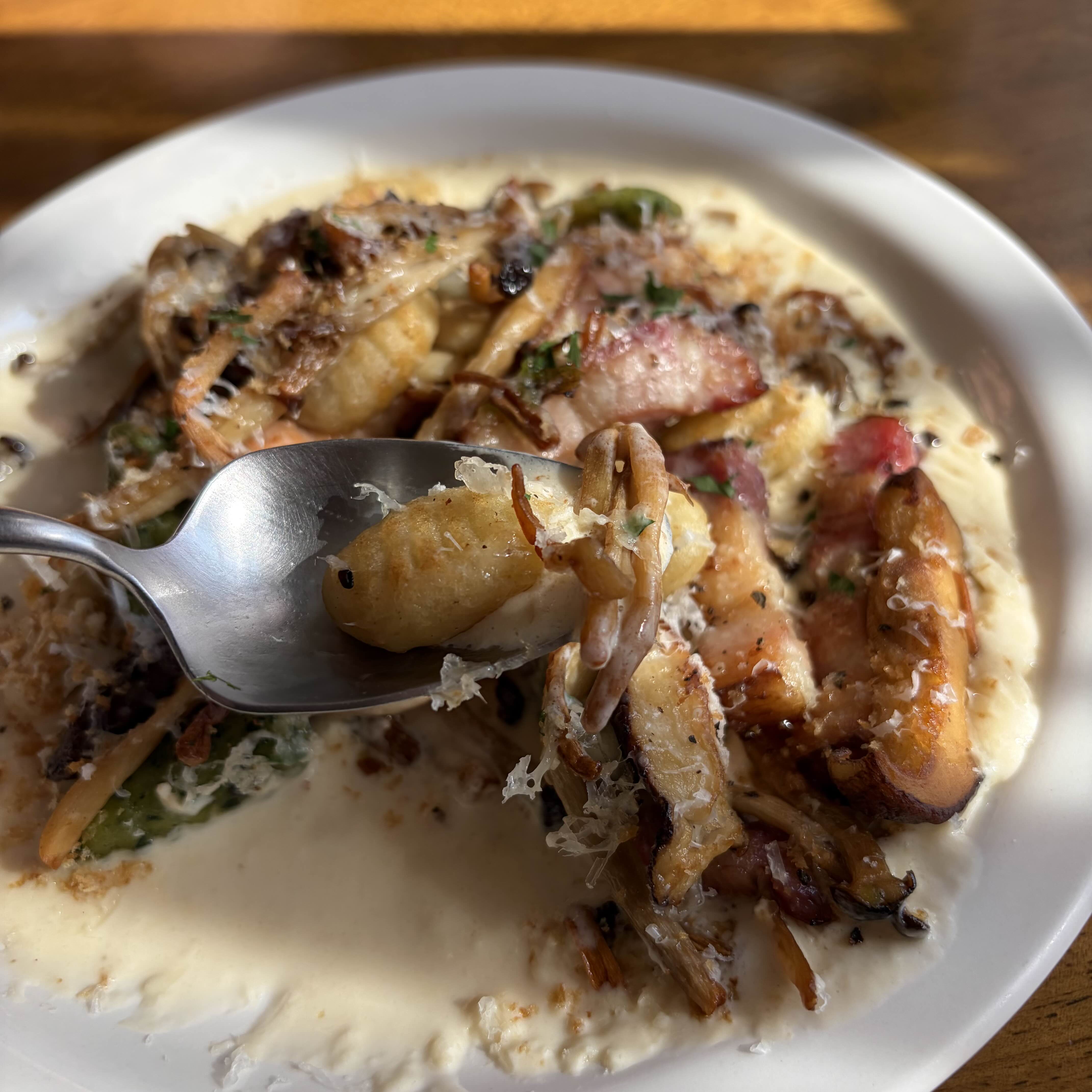 버섯을 좋아하는 오빠를 위해 주문한 홈메이드 베이컨&크림뇨끼(가격 18,000원)은 블루치즈로 만든 크림소스에 직접 훈연한 베이컨, 다양한 종류의 버섯, 쫀득한 뇨끼가 들어간 메뉴로 고소한 맛이 일품이었어요.