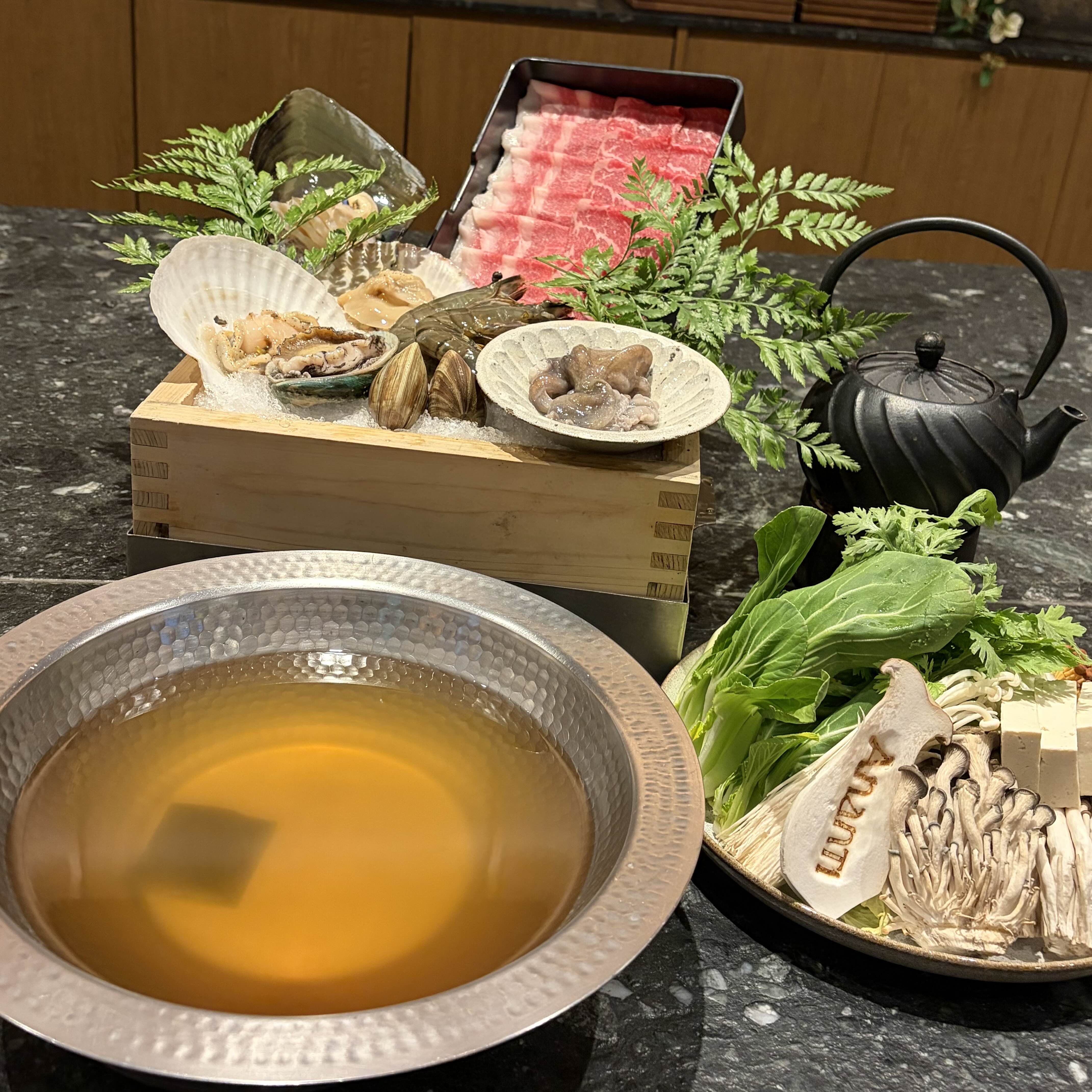 차돌박이 70g, 설깃살 70g, 제철 해산물(관자, 가리비, 타이거새우, 전복, 산낙지), 닭고기 완자, 야채 모둠, 면 또는 죽 구성으로 나와요. 진짜 프리미엄 샤브샤브 그 자체!